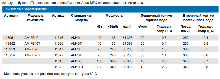 Артикул с буквой «Т» означает, что теплообменник Aqua MEX оснащен спиралью из титана