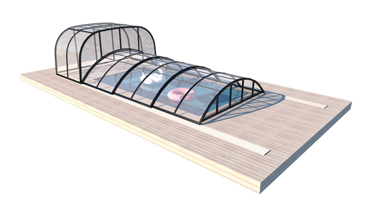 Комбинация модулей разной высоты. Высокая часть крыши обеспечивает комфорт и пространство у входа в бассейн, а низкая часть не нарушает атмосферу сада.