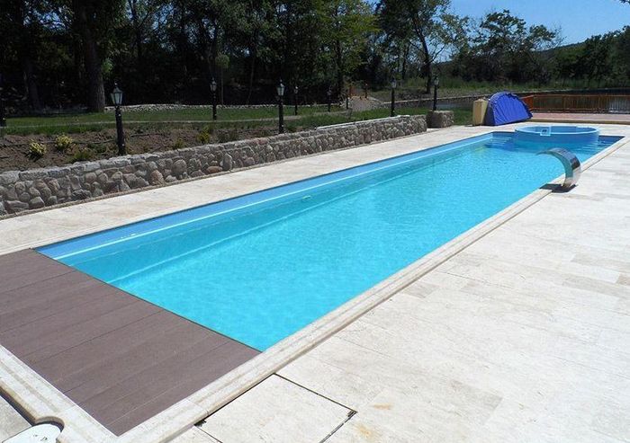 Прямокутний басейн з перехідною глибиною (від 0,8 до 1,5 м) чудово підійде для сімейного відпочинку.